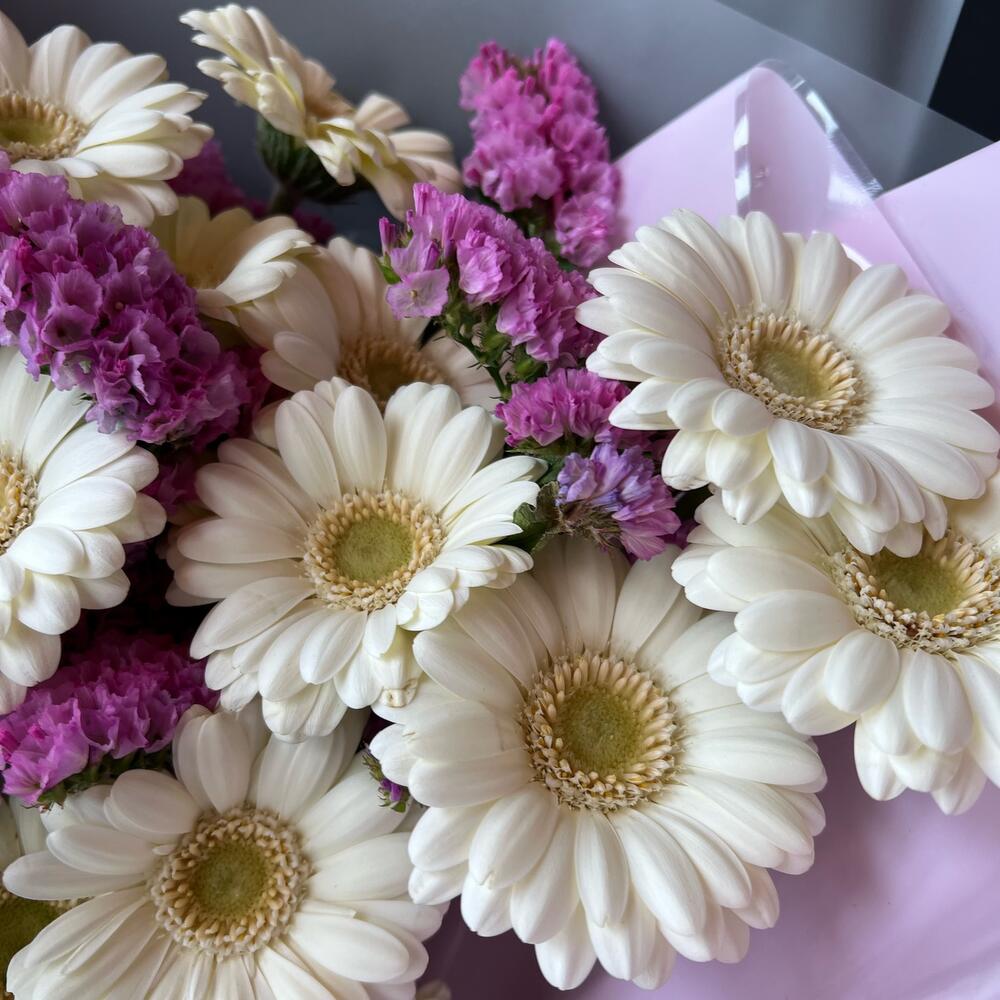 Букет с белыми Герберами и сиреневой статицей