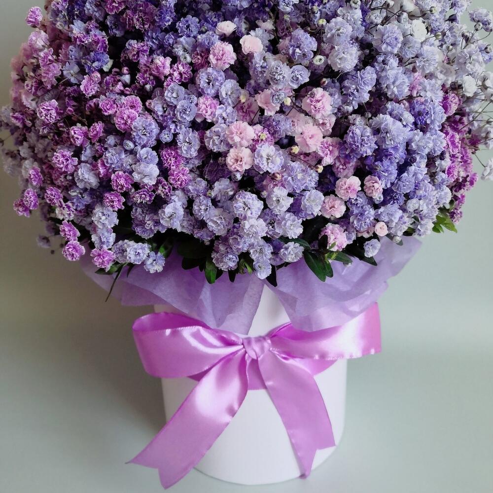 Гипсофила – 8 шт.Лента атласная – 1 шт.Тишью – 1 шт.Фисташка – 1 шт.Оазис флористический – 1 шт.шляпная коробка без крышки – 1 шт.