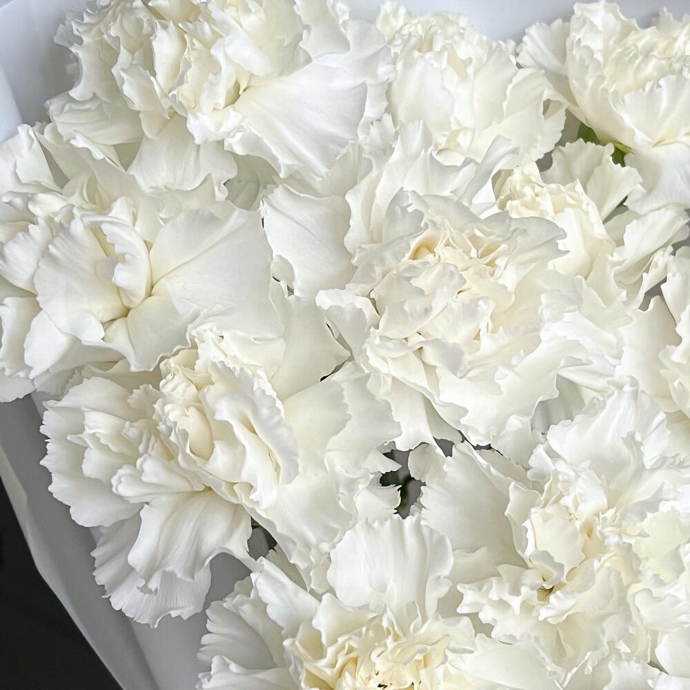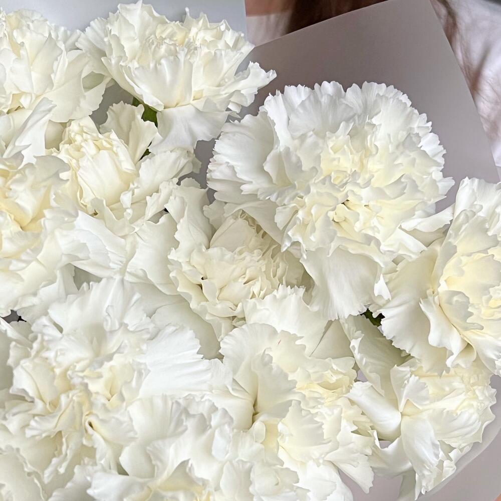 Гвоздика белая – 15 шт.Дизайнерская упаковка – 1 шт.Лента – 1 шт.
