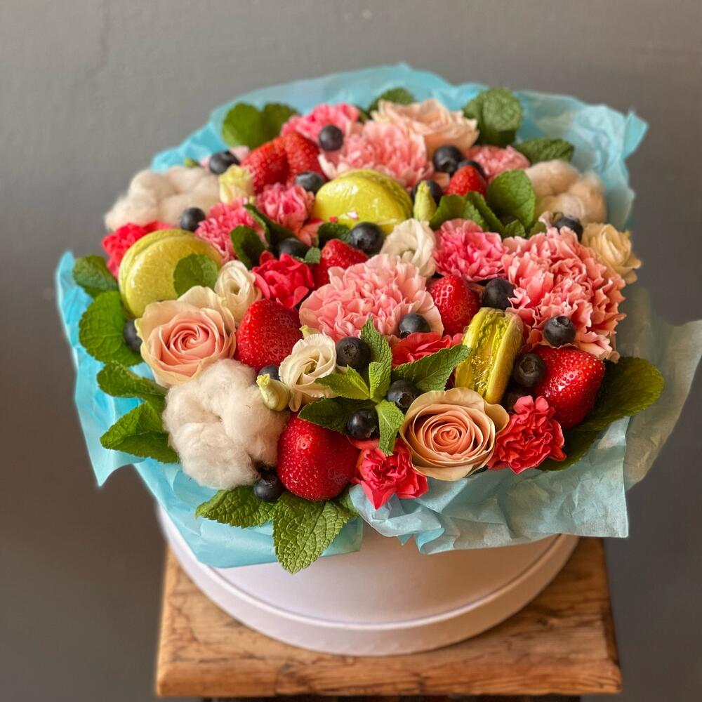 Клубника – 200 гр.Эустома – 6 шт.Тишью – 2 шт.Диантус – 3 шт.Коробка шляпная – 1 шт.Голубика – 125 гр.Диантус кустовой – 7 шт.Оазис флористический – 1 шт.Хлопок натуральный – 3 шт.макарон (пирожное) – 3 шт.мята свежая – 9 шт.розы – 3 шт.работа флориста – 1 шт.
