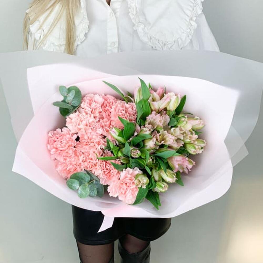 Упаковка – 1 шт.Альстромерия розовая – 10 шт.Диантус розовый – 15 шт.Эвкалипт – 1 шт.