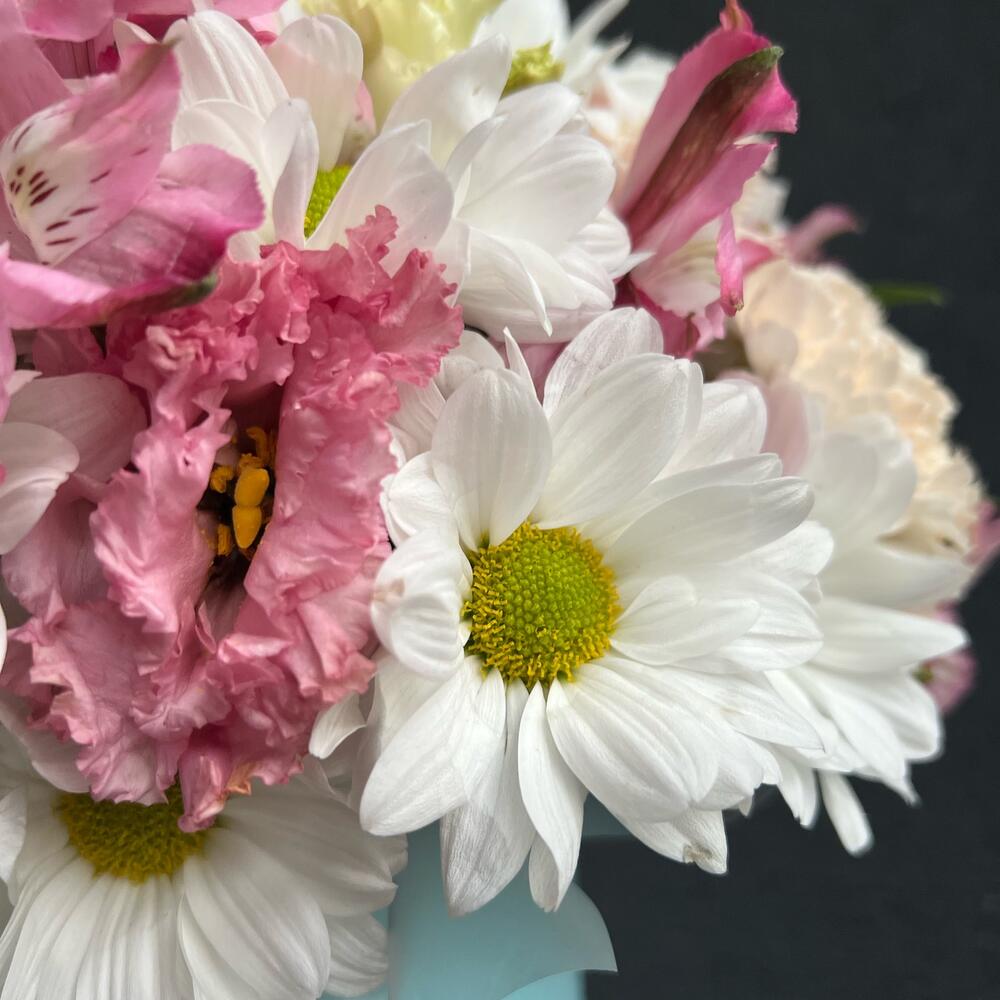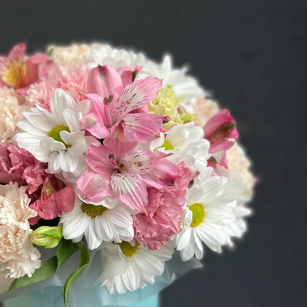 Лизиантус – 2 шт.Альстромерия – 4 шт.Диантус – 6 шт.Хризантема кустовая – 4 шт.Шляпная коробка – 1 шт.Флористическая губка – 1 шт.