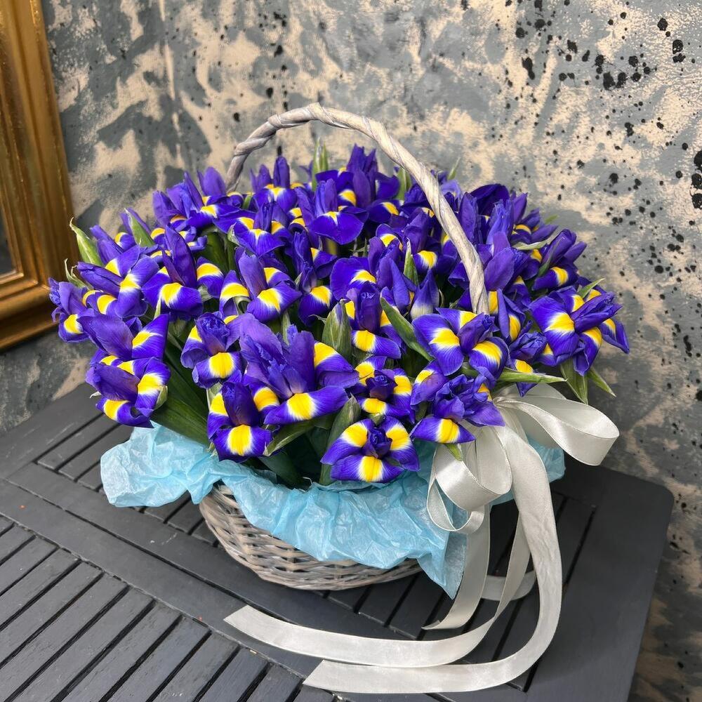 Ирис синий – 51 шт.Корзина плетеная – 1 шт.Упаковка дизайнерская – 1 шт.Лента атласная – 2 шт.Открыточка с вашими пожеланиями – 1 шт.хорошее настроение – 100 шт.инструкция по уходу за цветами – 1 шт.Кризал – 1 шт.