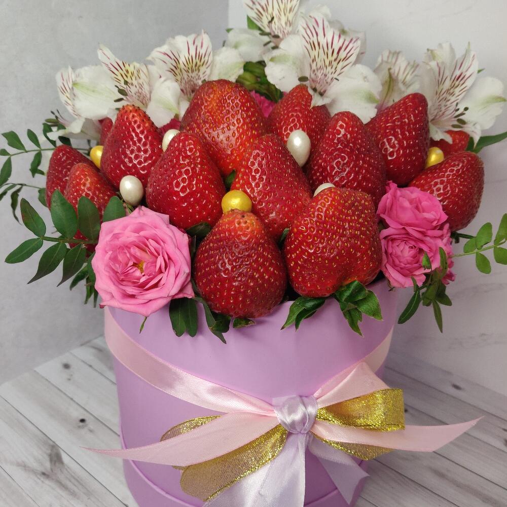 Альстромерия – 4 шт.Клубника – 800 гр.Кустовая роза – 5 шт.Шляпная коробка – 1 шт.Фисташка пучок – 3 шт.
