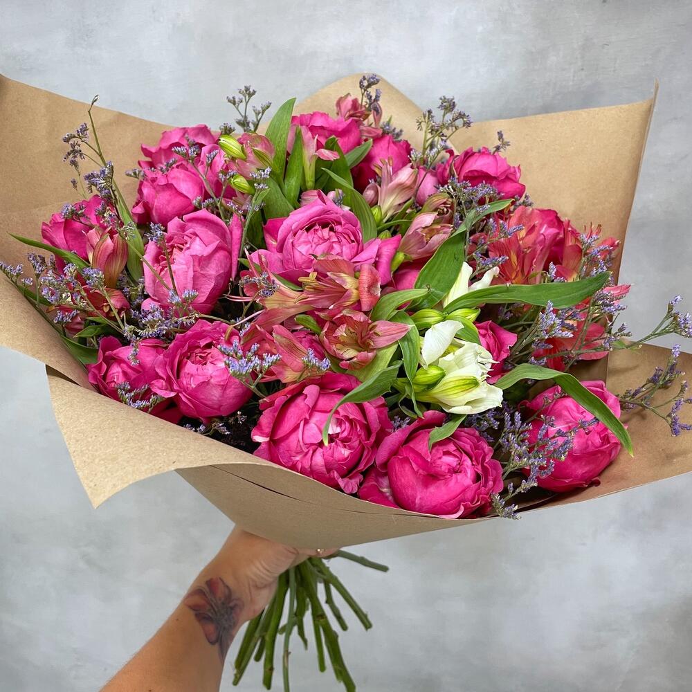 Альстромерия – 8 шт.Лимониум – 2 шт.Роза кустовая пионовидная – 7 шт.