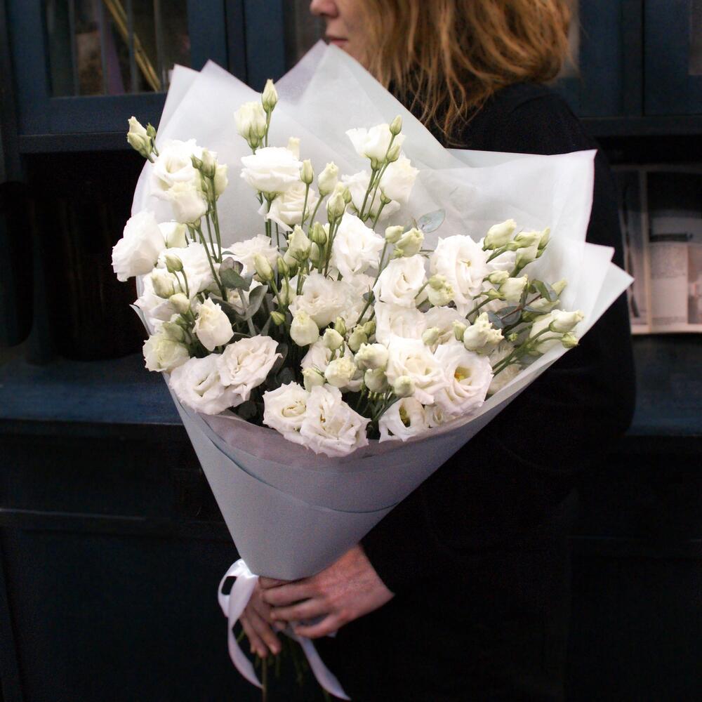 Эвкалипт – 3 шт.Эустома – 13 шт.Тишью – 2 шт.Атласная лента – 2 шт.Матовая пленка – 2 шт.