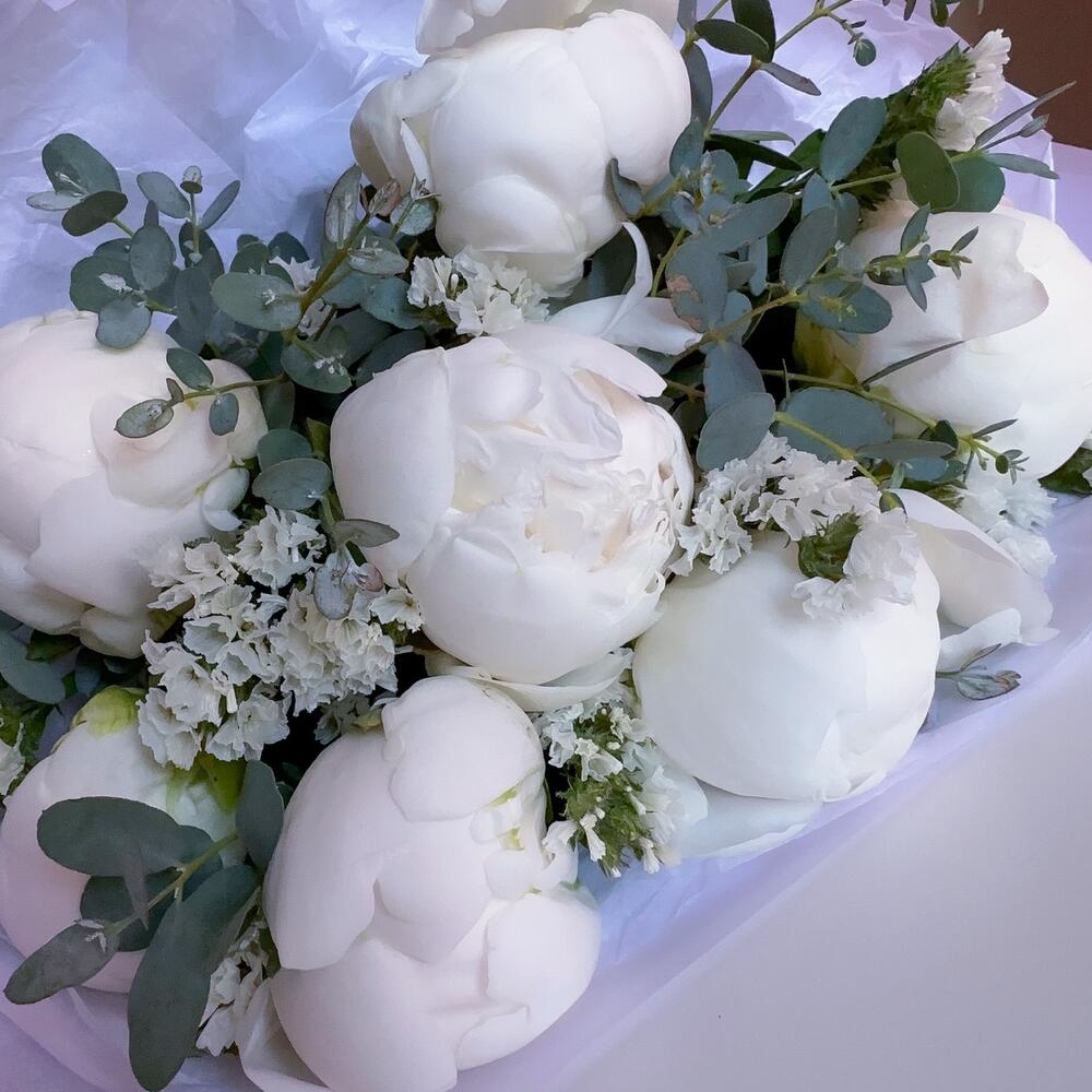 пионы – 7 шт.Статица – 3 шт.Эвкалипт – 2 шт.Упаковка дизайнерская – 1 шт.