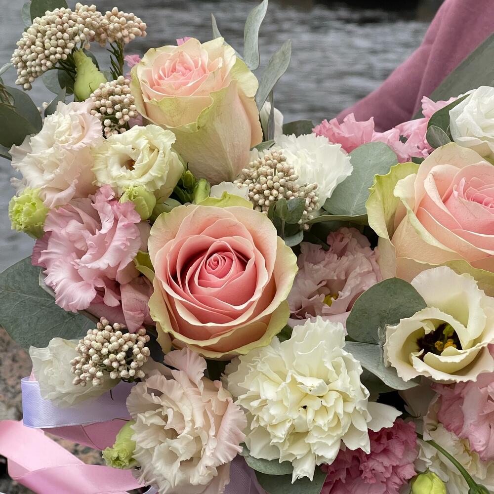 Категории: Гвоздики, Лизиантусы, Розы