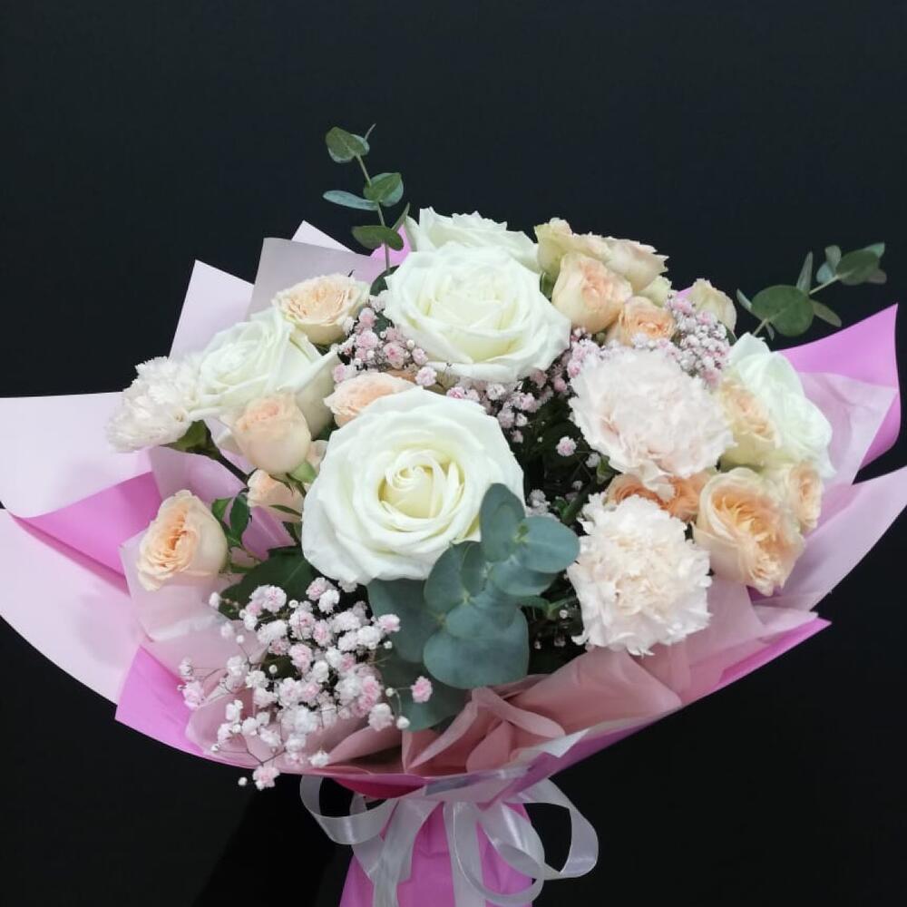 Роза кустовая – 5 шт. Эвкалипт – 3 шт. Лента атласная – 4 шт. Диантус – 3 шт. Слюда упаковка – 3 шт. салфетка декоративная – 5 шт. гипсофила радужная – 2 шт. роза плей бланка – 5 шт.