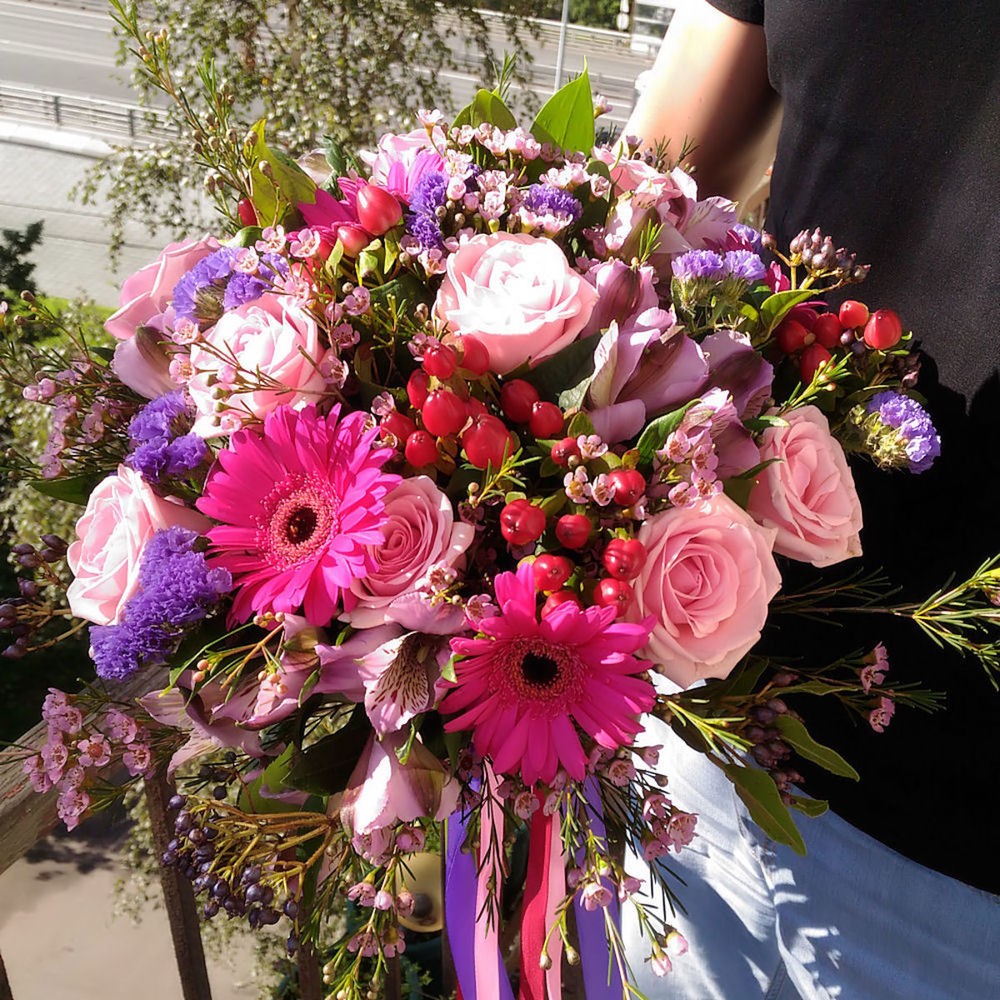 Роза – 9 шт.Гербера – 5 шт.Хиперикум – 5 шт.Статица – 5 шт.Ваксфлауэр – 5 шт.Альстромерия – 5 шт.зелень декоративная – 1 шт.Лента – 3 шт.