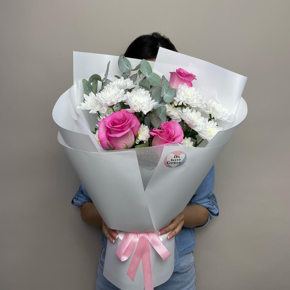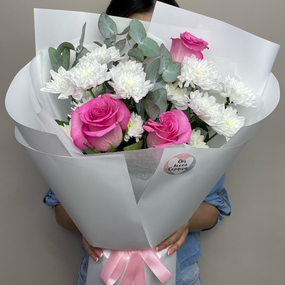 Альстромерии, Гвоздики, Кустовые розы, Лизиантусы, Розы, Хризантемы