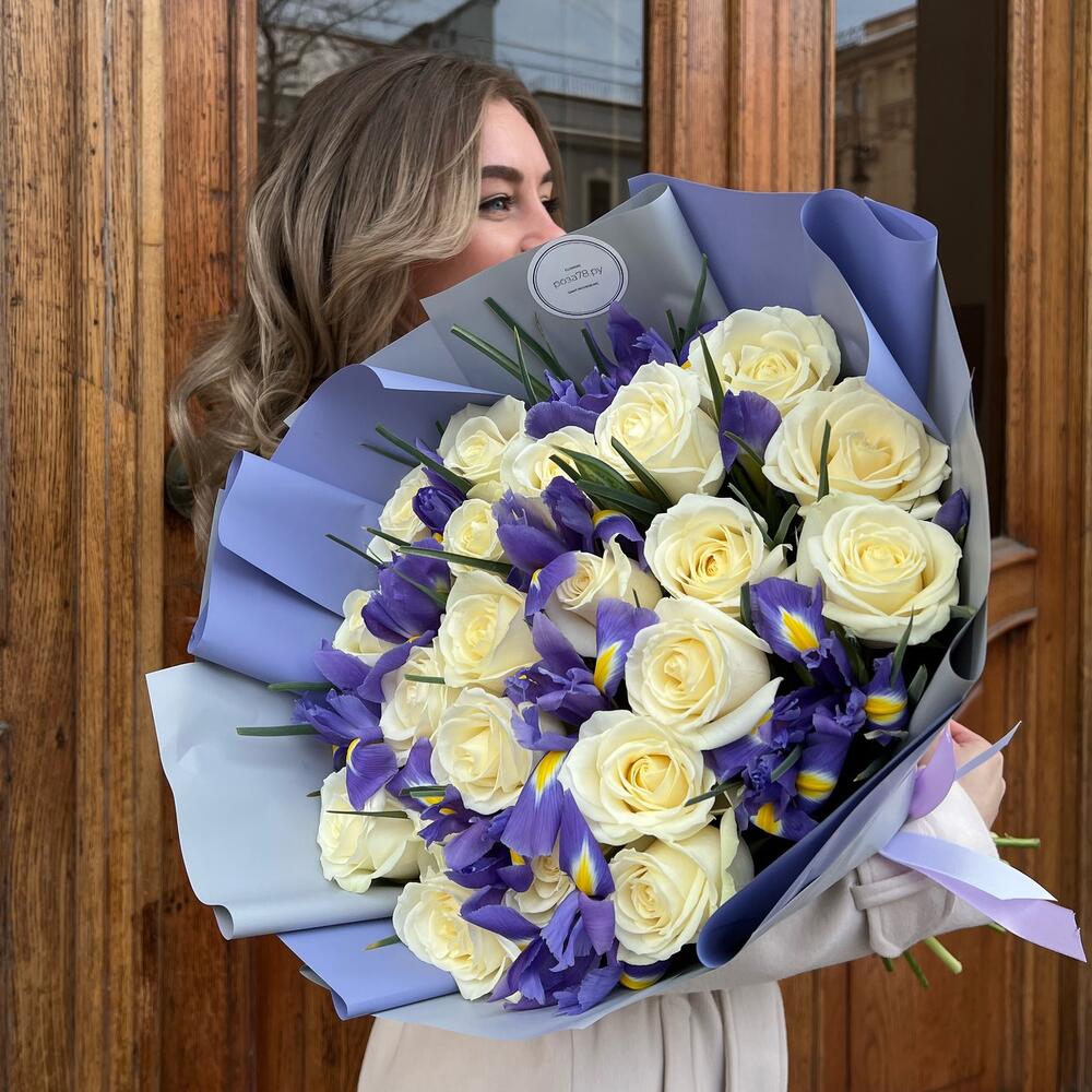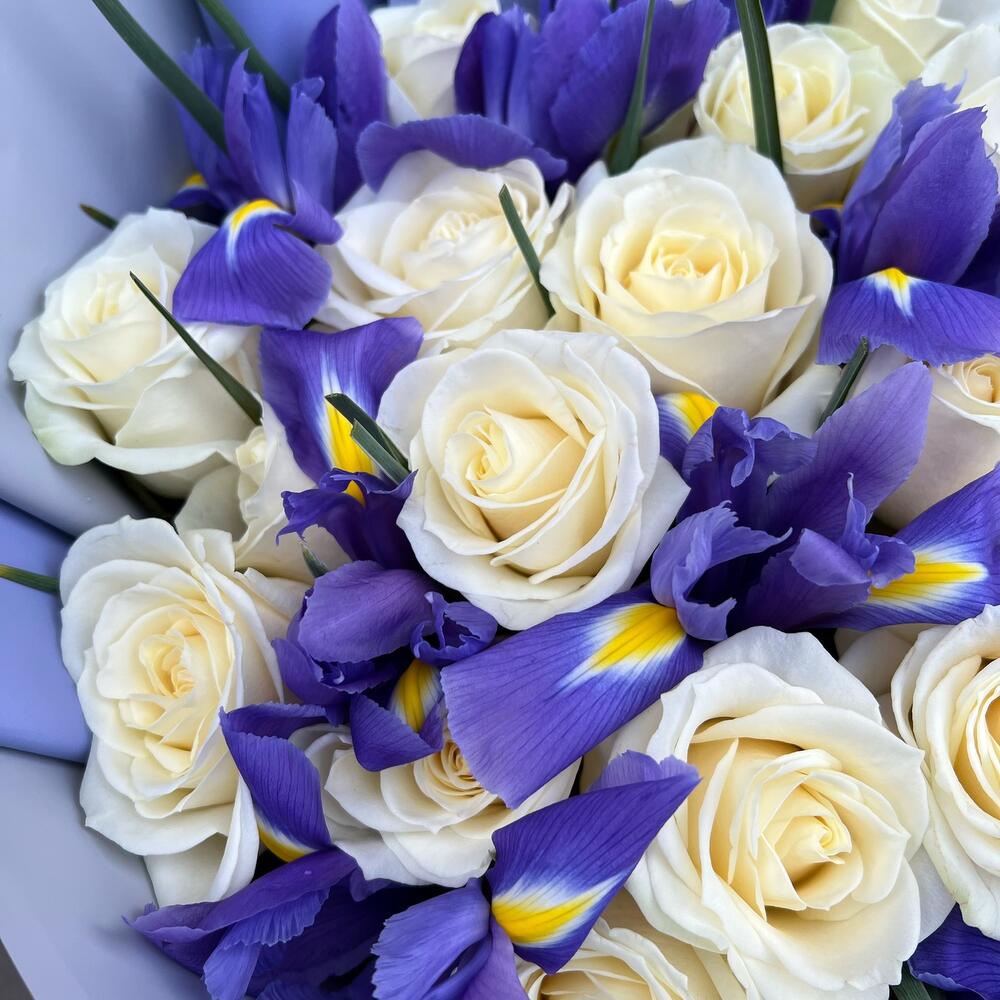 Ирис Blue Magic – 14 шт.Роза белая 60 см – 21 шт.дизанерская упаковка – 5 шт.Тишью – 1 шт.Лента атласная – 2 шт.