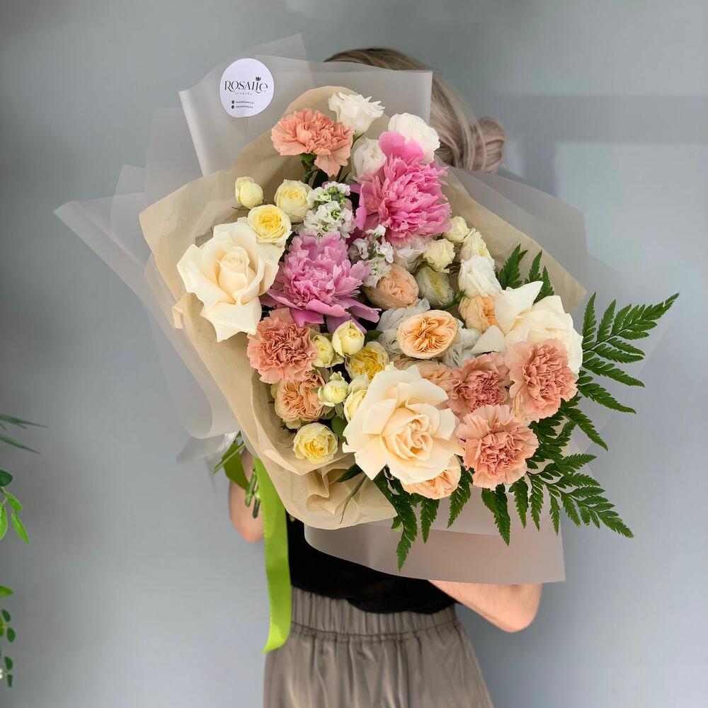 Альстромерии, Кустовые розы, Лизиантусы, Пионовидные розы, Розы, Ромашки