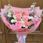 Роза розовая – 4 шт.Роза кустовая – 2 шт.Лизиантус – 2 шт.Маттиола – 3 шт.Дизайнерская упаковка – 1 шт.октрыточка с вашими пожеланиями – 1 шт.Шоколадка – 1 шт.