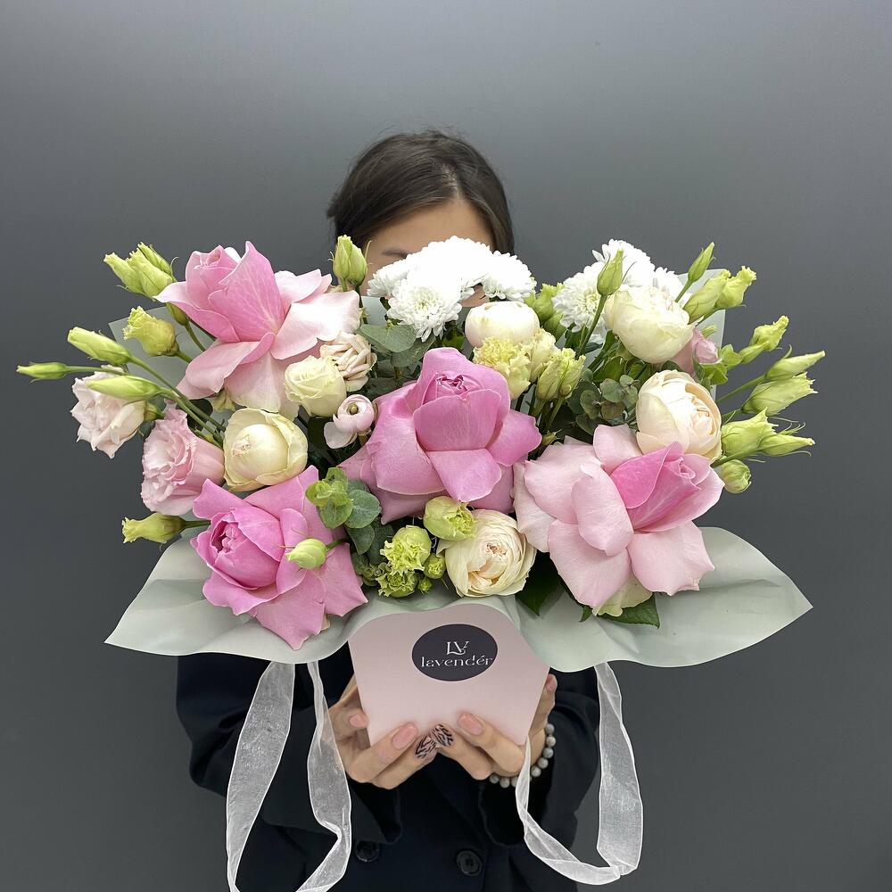 Гвоздики, Лизиантусы, Розы, Тюльпаны