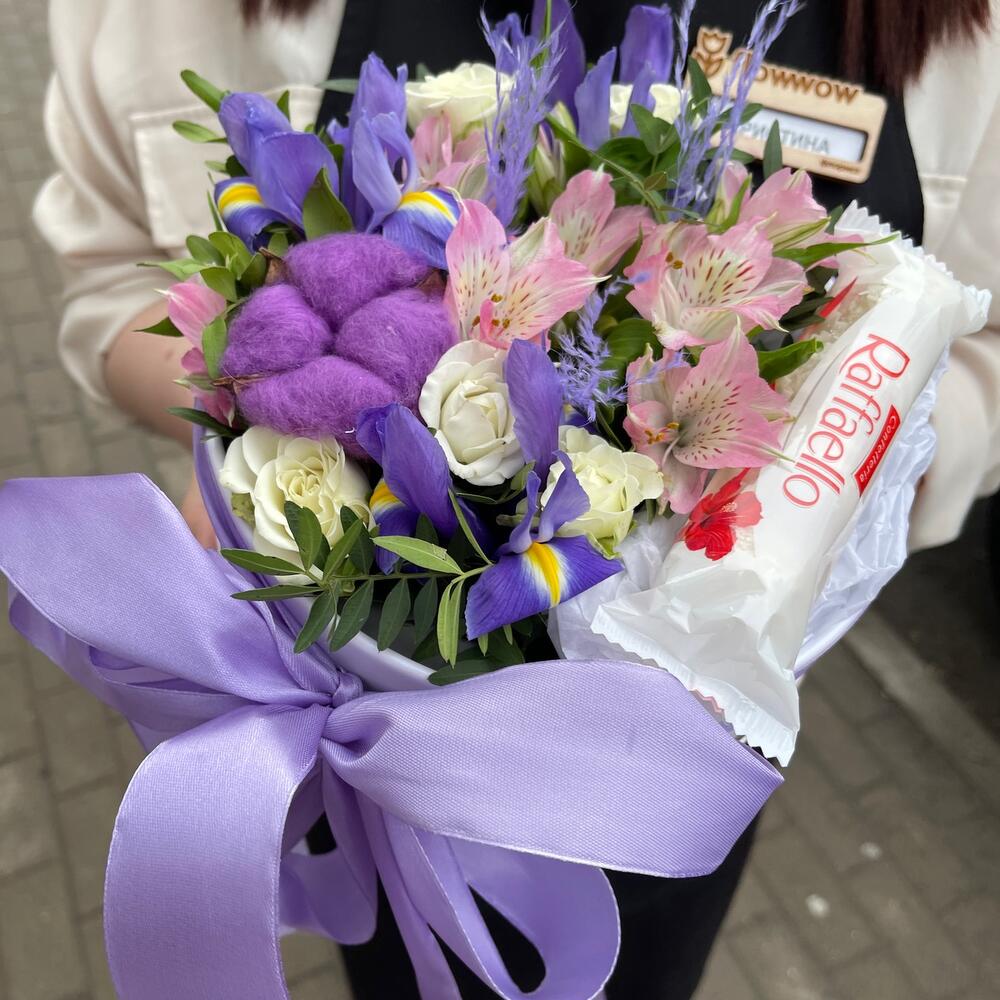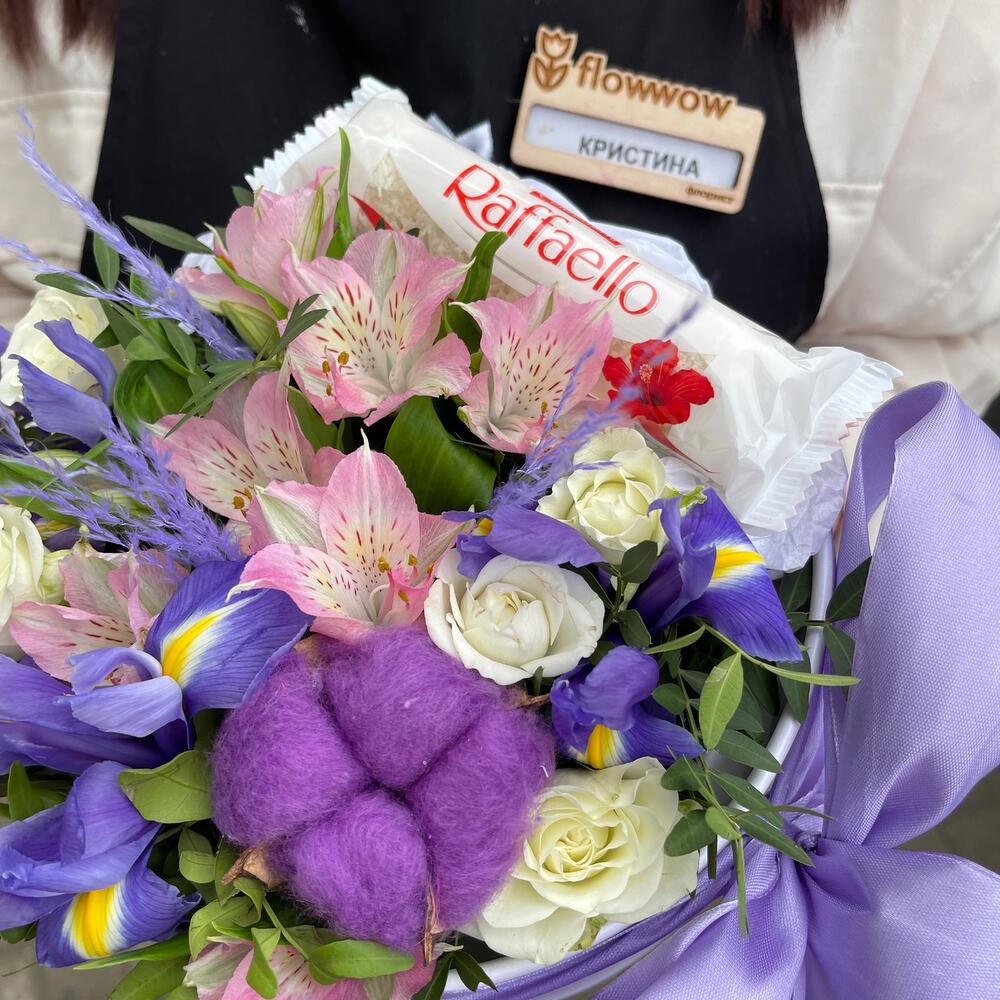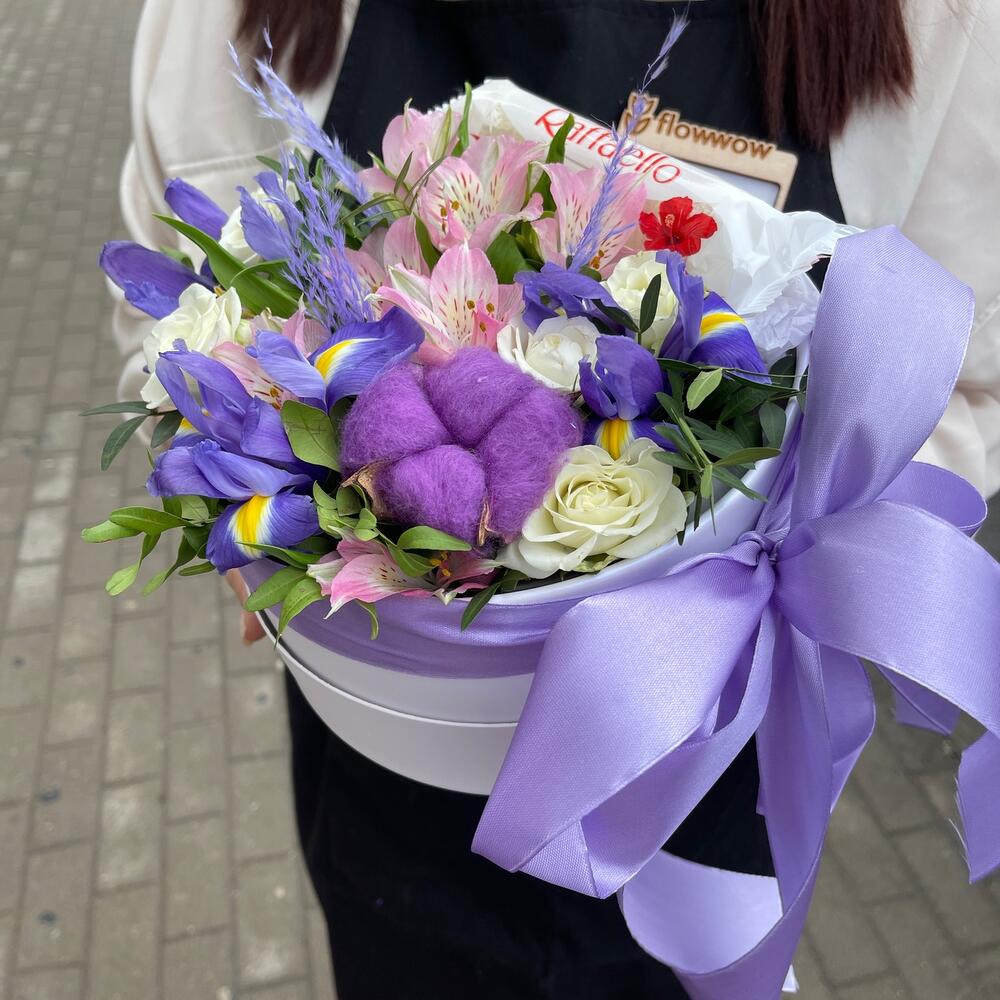 Коробка – 1 шт.Оазис флористический – 1 шт.Ирис – 3 шт.Хлопок – 1 шт.Альстромерия – 1 шт.Роза кустовая – 2 шт.Фисташка – 1 шт.Конфеты Raffaello – 1 шт.