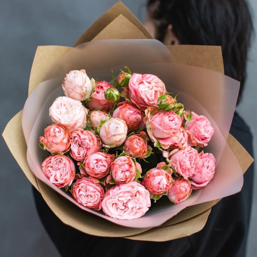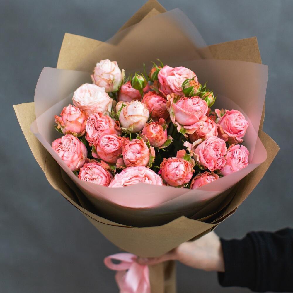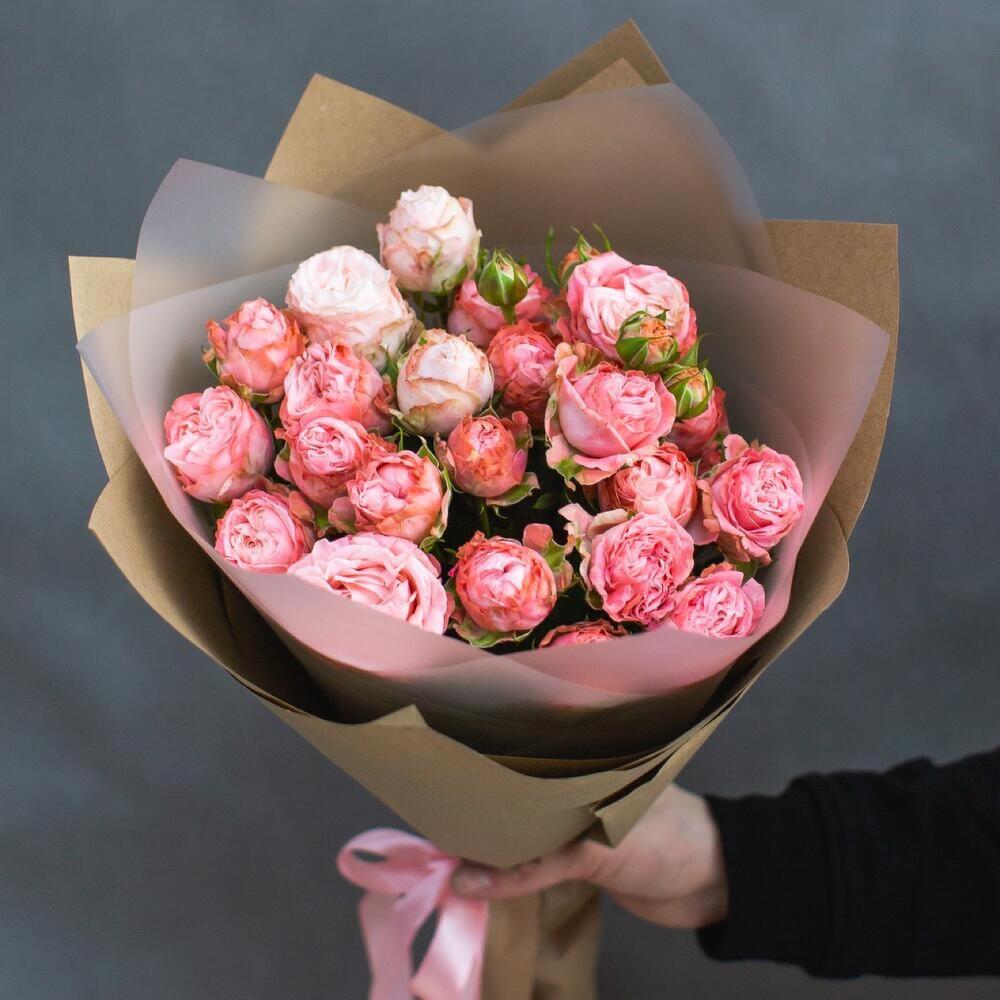 Пионовидная кустовая роза – 5 шт. Упаковка дизайнерская – 2 шт. Атласная лента – 1 шт. Открыточка с вашими пожеланиями – 1 шт.