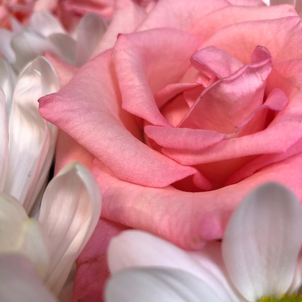 Вероника – 10 шт.Роза розовая – 9 шт.Хризантема кустовая белая – 3 шт.Хризантема одноголовая белая – 1 шт.