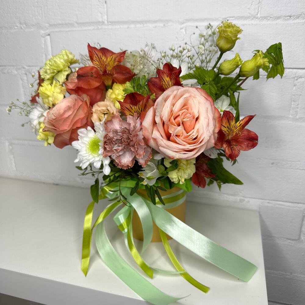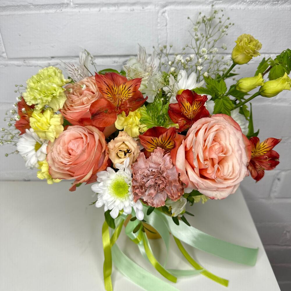 Роза Эквадор – 3 шт.Альстромерия – 5 шт.Диантус кустовой – 3 шт.Гипсофила – 3 шт.Фисташка – 3 шт.Оазис флористический – 1 шт.Шляпная коробка с лентами – 1 шт.