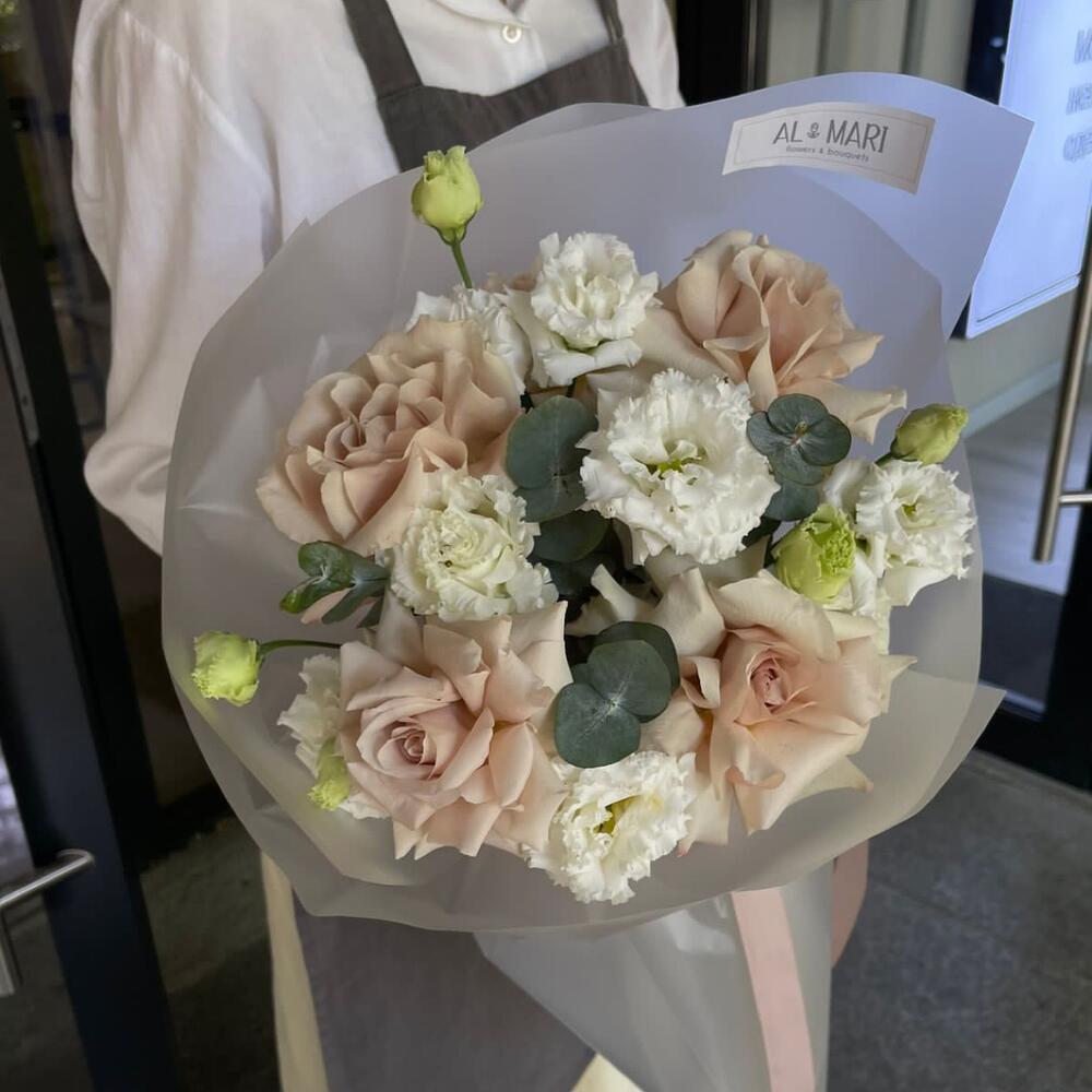 Альстромерии, Гвоздики, Кустовые розы, Лизиантусы, Розы, Хризантемы