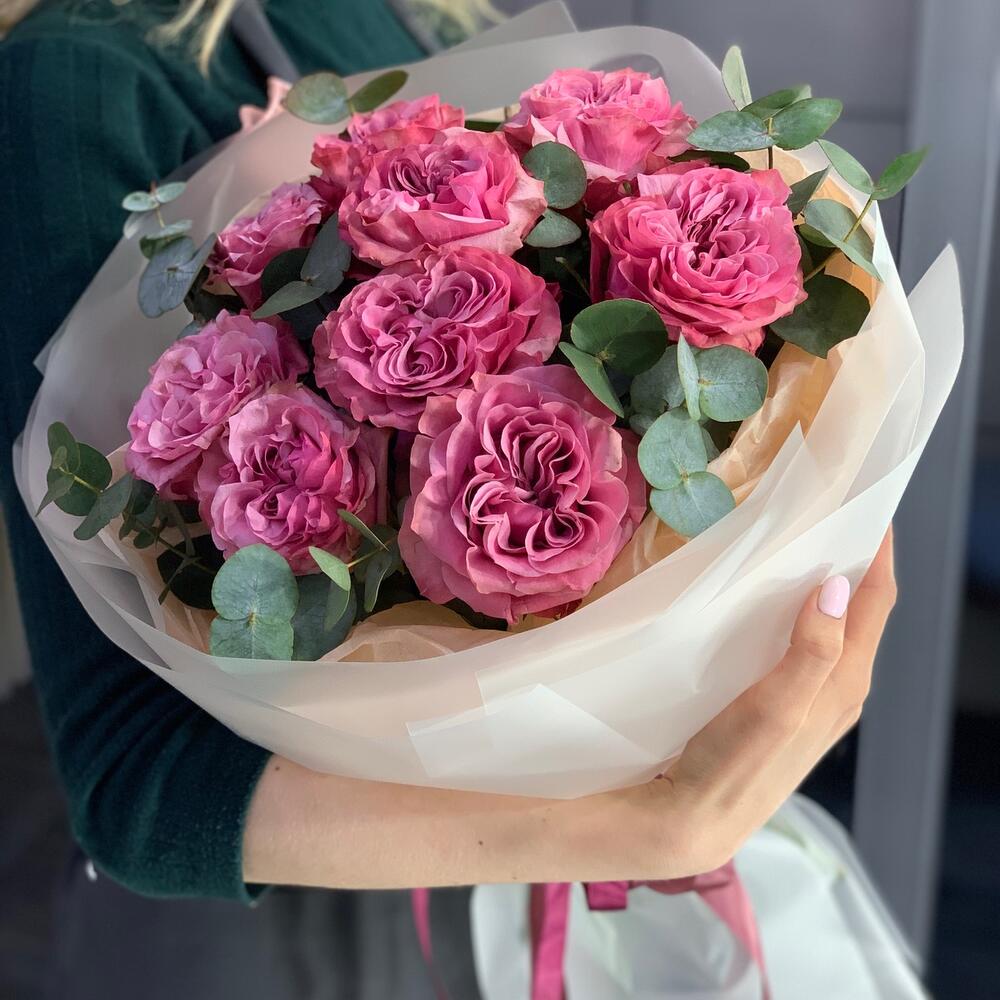 Пионовидная роза – 9 шт.Эвкалипт – 3 шт.Дизайнерская упаковка – 2 шт.