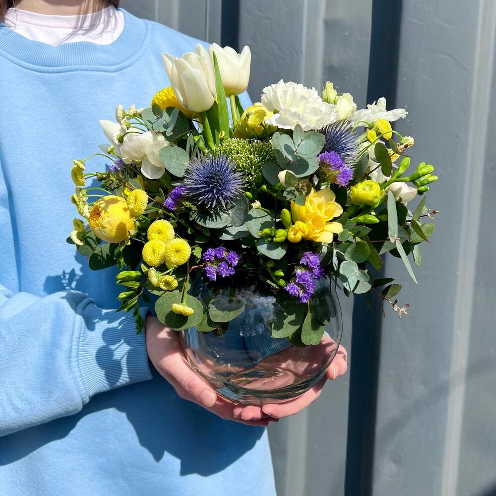 Статица – 1 шт.Трахелиум – 1 шт.Тюльпан – 3 шт.Фрезия – 2 шт.Диантус – 4 шт.Матрикария – 2 шт.Ваза стекло – 1 шт.Роза кустовая пионовидная – 1 шт.комплимент от polyanka – 1 шт.эрингим – 1 шт.