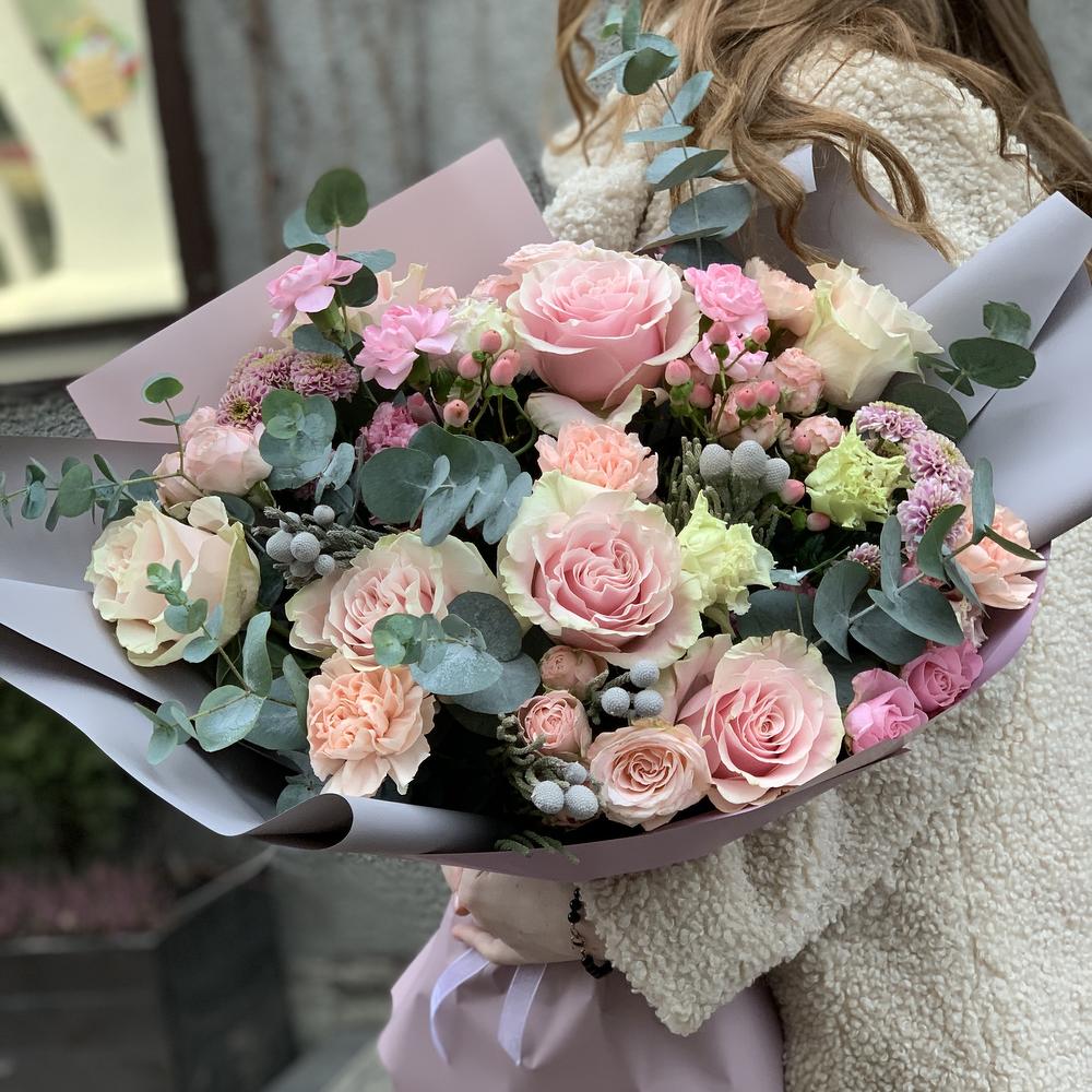 Роза – 7 шт.Диантус кустовой – 7 шт.Диантус – 5 шт.Бруния – 3 шт.Хиперикум – 3 шт.Эвкалипт – 5 шт.Дизайнерская упаковка – 2 шт.атласный бант – 1 шт.Роза кустовая – 3 шт.Лизиантус алиса пинк – 3 шт.