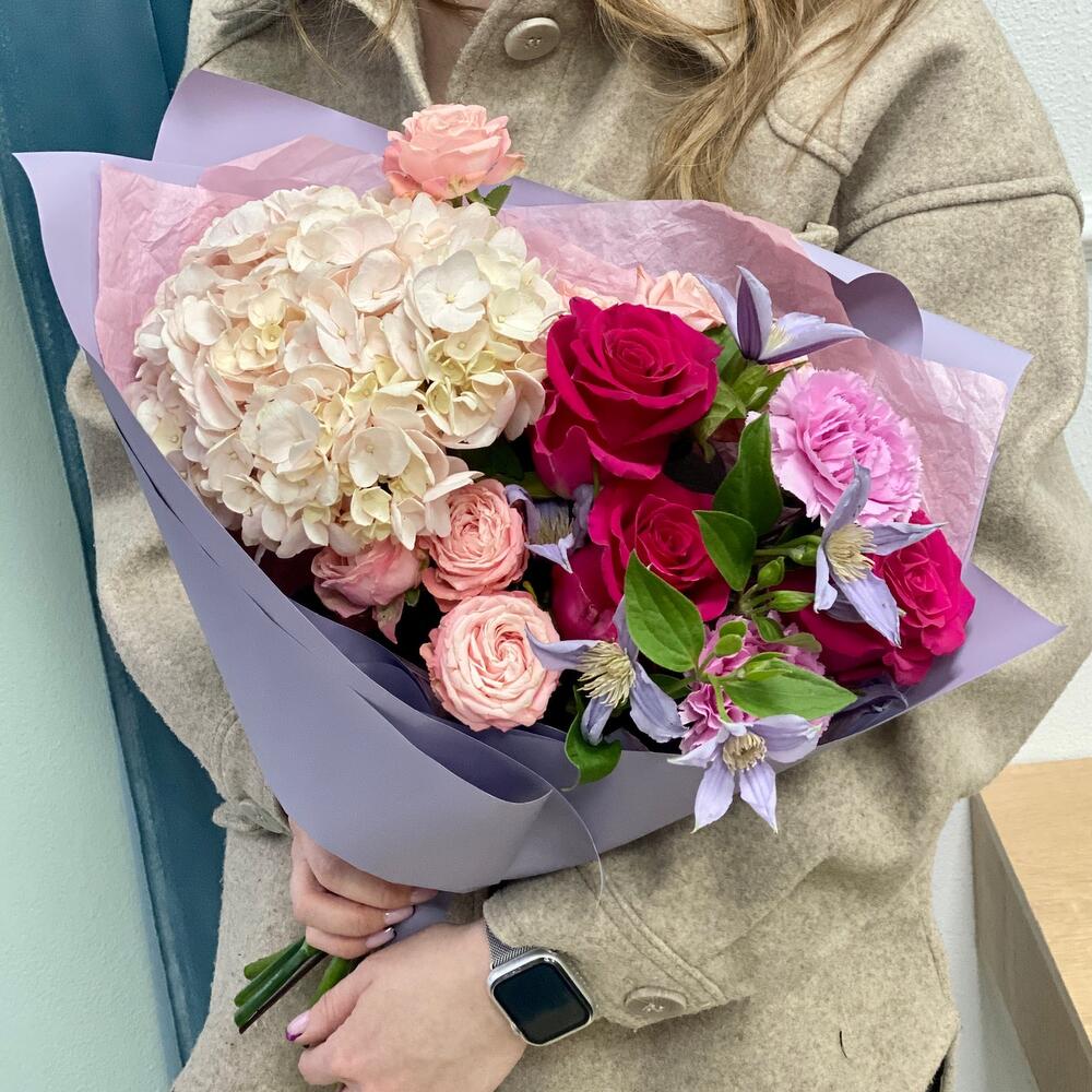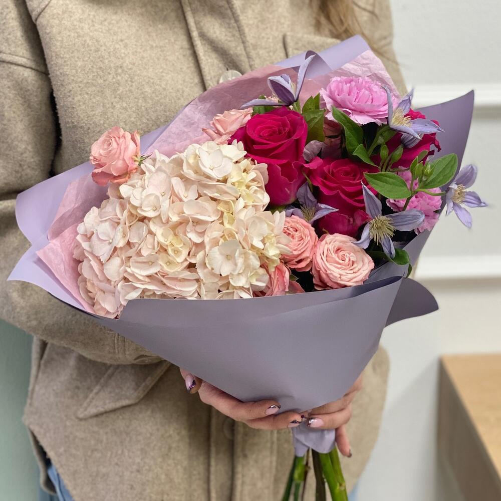 Гортензия – 1 шт.Тишью – 1 шт.Клематис – 2 шт.Пленка матовая – 1 шт.Диантус сортовой – 2 шт.Мадам бомбастик – 2 шт.Роза – 3 шт.