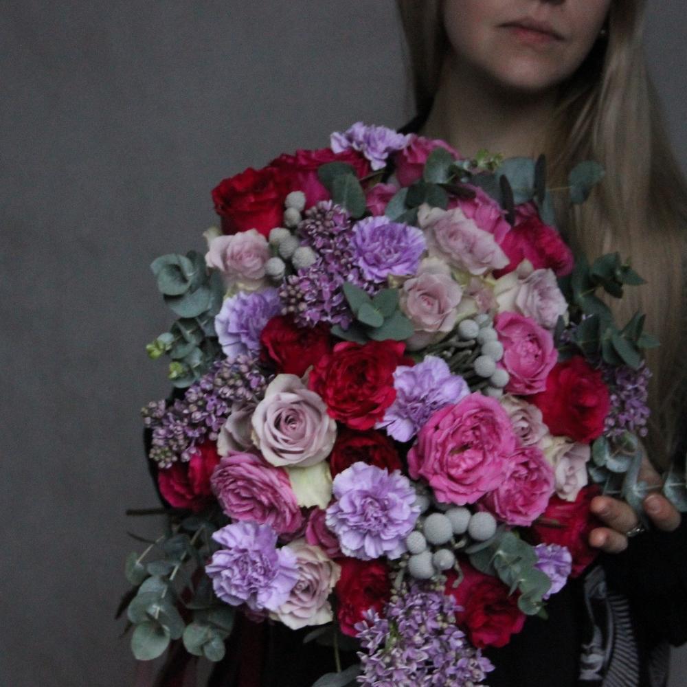 Роскошный букет классической круглой формы, в сиреневых тонах.А составе – сирень, розы пионовидные и эквадорские, бруния, диантус и эвкалипт.Высота букета около 60 сантиметров, ширина букета около 45 сантиметров.Стильное цветочное решение для любого случая.