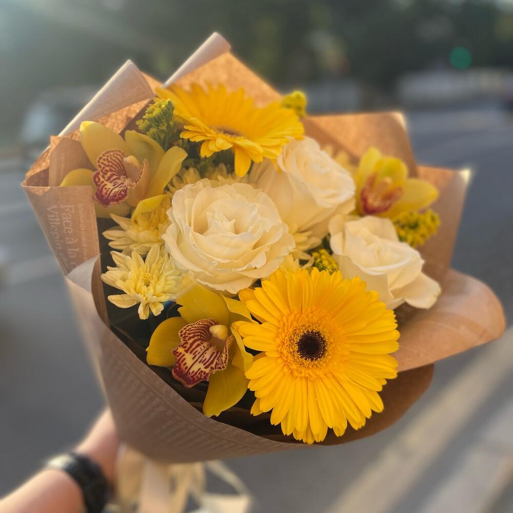Гербера – 2 шт.Орхидея Цимбидиум – 3 шт.Рускус – 5 шт.Роза Эквадор – 3 шт.Солидаго – 3 шт.Хризантема кустовая – 2 шт.Упаковка дизайнерская – 5 шт.Лента атласная – 1 шт.