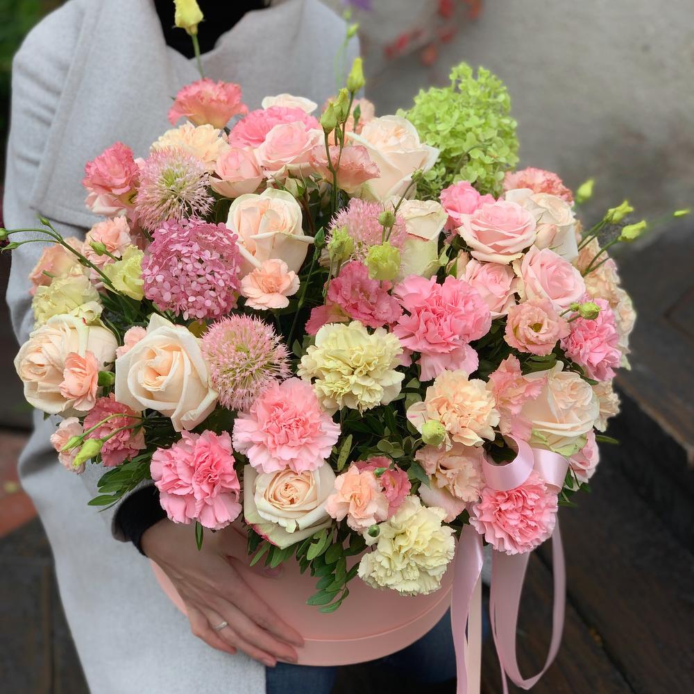 Роза кустовая – 5 шт.Лента атласная – 3 шт.Диантус – 23 шт.Коробка шляпная – 1 шт.Фисташка – 10 шт.Роза пионовидная – 11 шт.Диантус кустовой – 3 шт.Лизиантус розовый – 8 шт.Декоративные цветы – 5 шт.Оазис флористический – 3 шт.