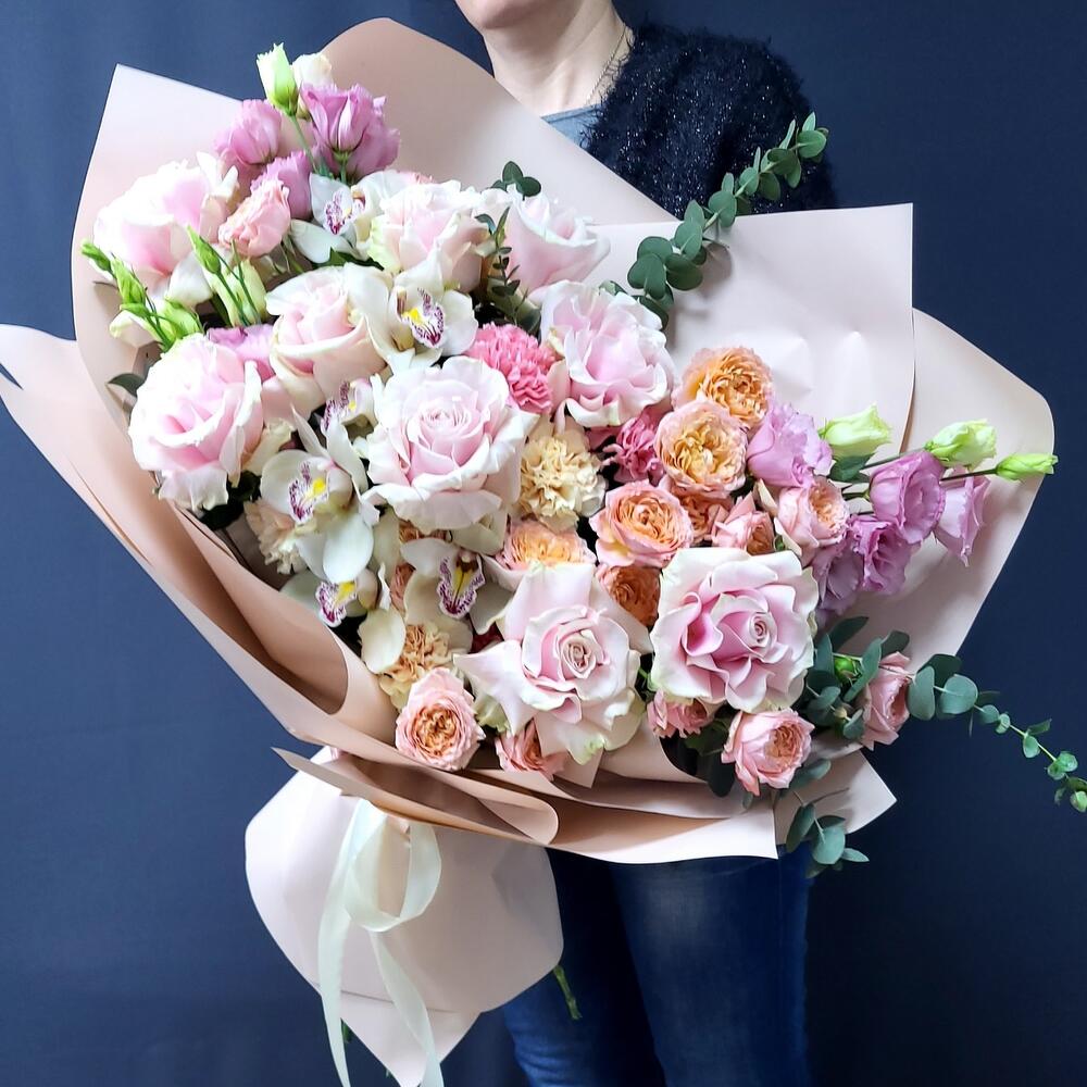 Лизиантус – 5 шт.Эвкалипт – 5 шт.Роза – 9 шт.Гвоздика – 8 шт.Фисташка – 7 шт.Роза пионовидная – 5 шт.Упаковка дизайнерская – 1 шт.орхидеи цимбидиум (бутон) – 6 шт.