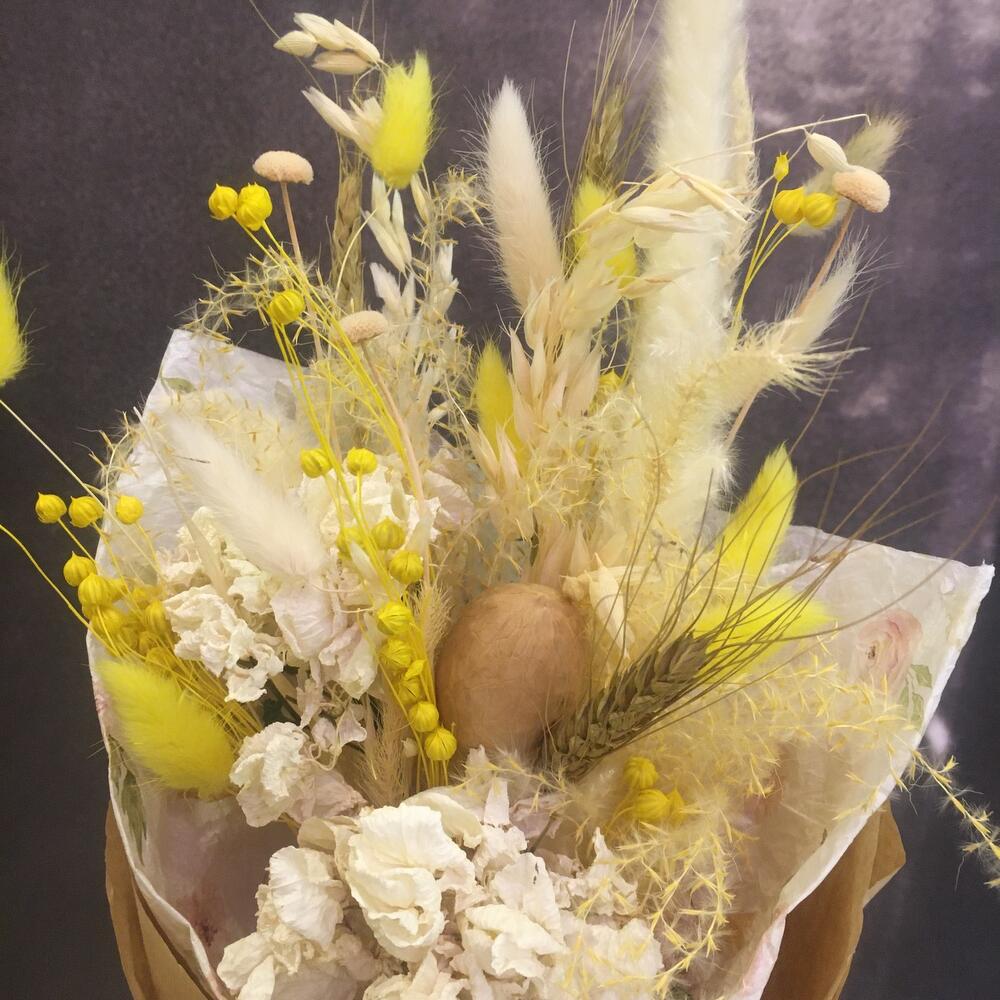 гортензия сухоцвет – 2 шт.рож – 2 шт.Лагурус – 8 шт.Ковыль – 2 шт.дополнительные цветы – 7 шт.Грецкий орех – 1 шт.