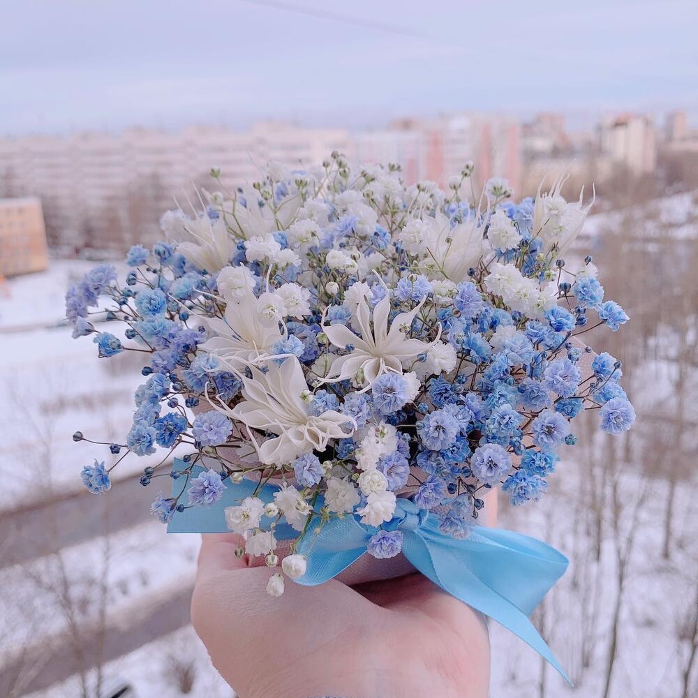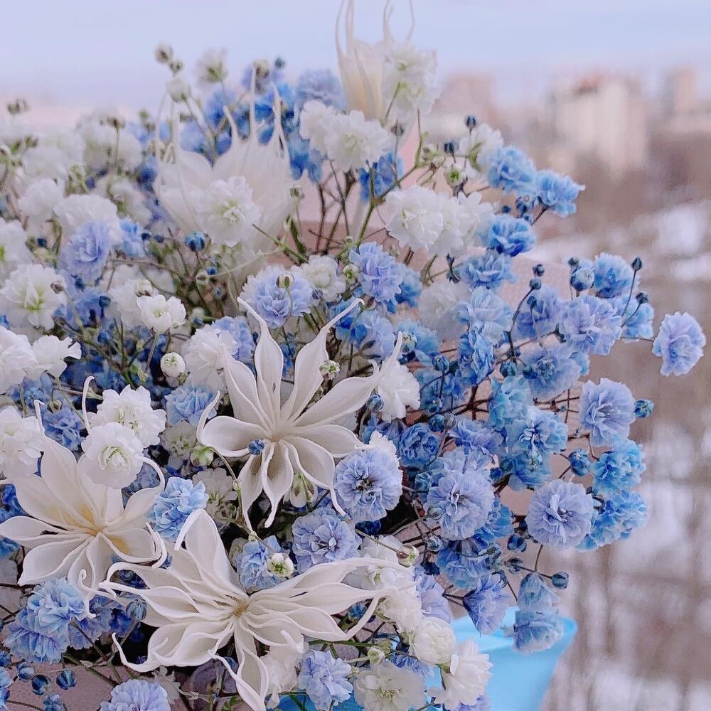 Нигелла сухоцвет – 7 шт.Гипсофила голубая – 1 шт.гипсофила белая – 1 шт.Флористическая губка – 1 шт.